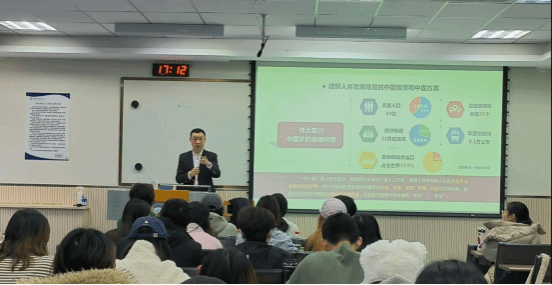 新时代中国特色大国外交秉持人类命运共同体理念。在这一时代背景下,为深入贯彻习近平外交思想,引导新时代青年学子找准人生定位、为国家发展贡献力量,12月10日,吴耀武校长以“新时代中国特色大国外交与西外人的使命和责任”为主题,结合自身在西外的教学与管理经历,特别是近年来学校紧跟国家战略实现的跨越式发展,为2024级工商管理专业70名学生带来了一堂兼具政治高度、情感温度、理论深度与视野广度的专题思想政治课。